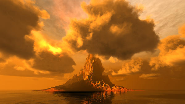 Orange global ambient, Orange sun with diffuse 400. Tall flat slab. Default terrain. Infinite water. Sky made by Horo and myself gives sunset distant sky. Build time about 5 minutes, Render time shown.