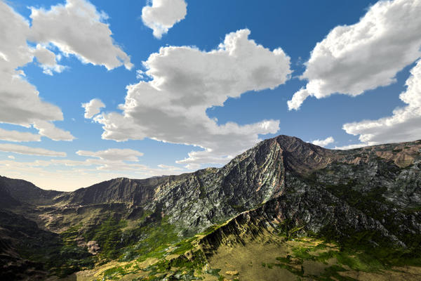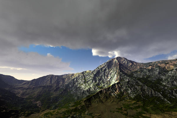 I've also spent a couple of hours on the clouds. Not that it took hours to set them up, but to play around with them, adjusting this and that. My main issue is how the clouds hide the sun and create shadows - though with soft transitions, which is very nice. I think either a distant light, a dome light (without casting shadows and excluding the slab) or an HDRI (also excluding the slab) is needed. Below two test renders using an HDRI with a moderate dynamic range (around 4000 to 1) with the sun in the sky. It is positioned so that both suns (the Bryce and the HDRI ones) are at the same location (though the HDRI is 14° higher up). Both renders have approximately the same clouds (filter and size settings) but at different height. Another caveat is that bringing the clouds down to cover the mountain summit seems to make the clouds lose the transparency and white bands appear.