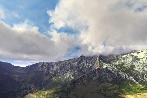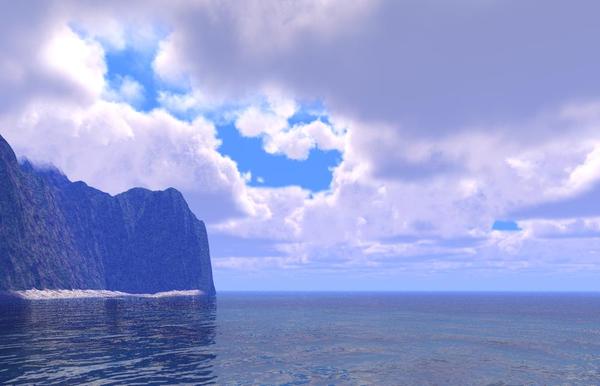 Lighting. The issue with volume clouds and excluded light. This is a curious thing and something that also has a bearing on light sensitive materials. Now since we are no longer in a position to quiz the programmers we cannot know for certain what happens. But I know from tests that a volumetric material "coats" the surface of geometries that intersect rather than passing into them and it is on this clipped surface where things go wrong. A close look at what happens in these situations show that when an excluded cloud lights up a mountain top for example, it is as if the mountain top itself were lit with ambient light and not the cloud. When I have time to do so, I intend to look closer at this. If this issue could be overcome then more efficient rendering of intersecting clouds could be done, otherwise so far as I know the only way to do this otherwise is not to exclude the cloud and accept a long render time. Which is not that desirable.