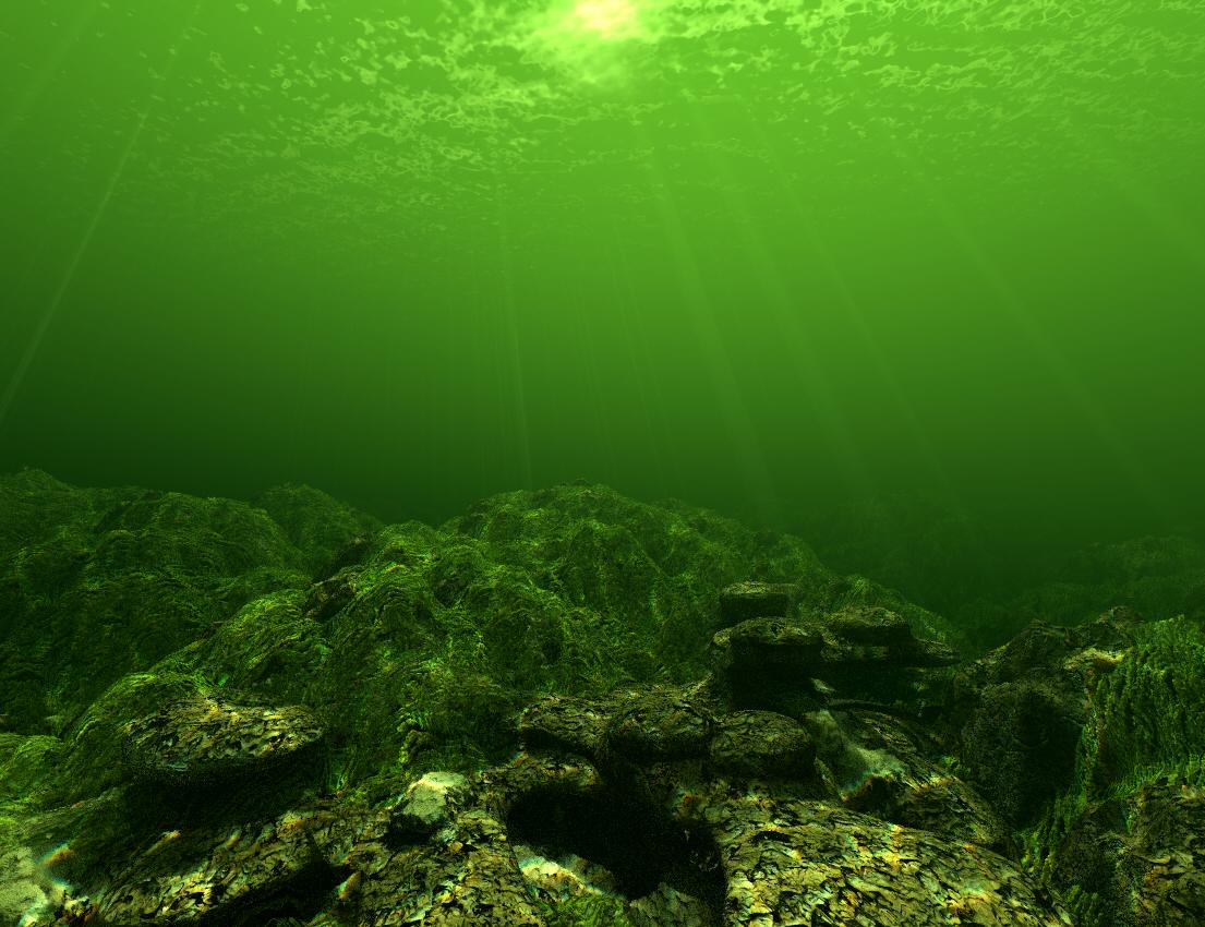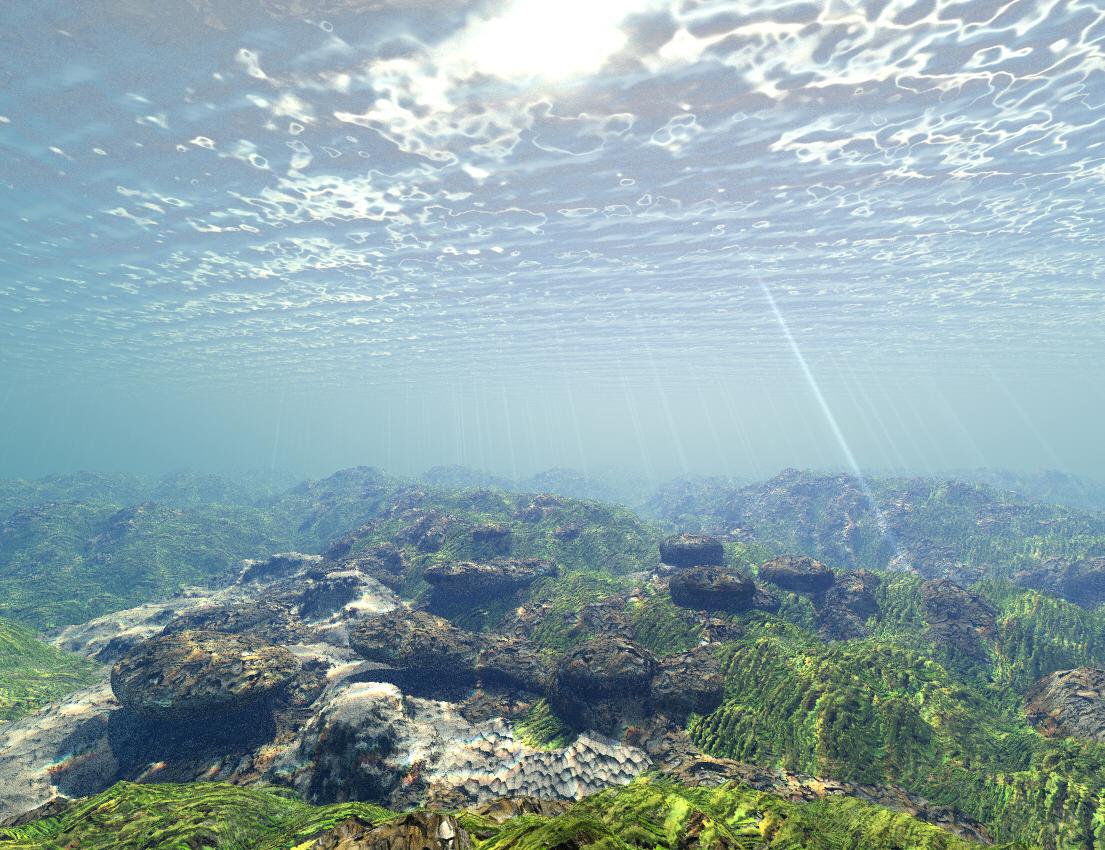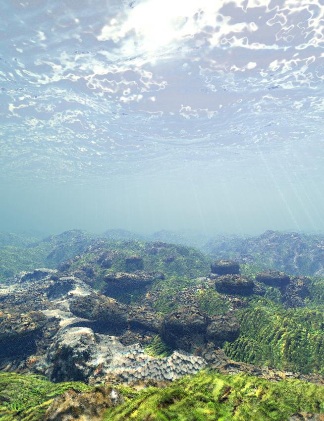 Thank you for your kind remarks. Like Hansmar the under side of the sea in the last image has been bothering me. I've tried several approaches. Pre-rendered and mapped images, this infinte bumpy plane and here's another one, this uses the "trick" of using a terrain which I can just about get away with thanks to the murkyness of the water. I shied away from this initially due to concerns over ramping the render time, but it did not have much impact on that as it happens. The overall aim is to capture the right feel for the underwateryness.