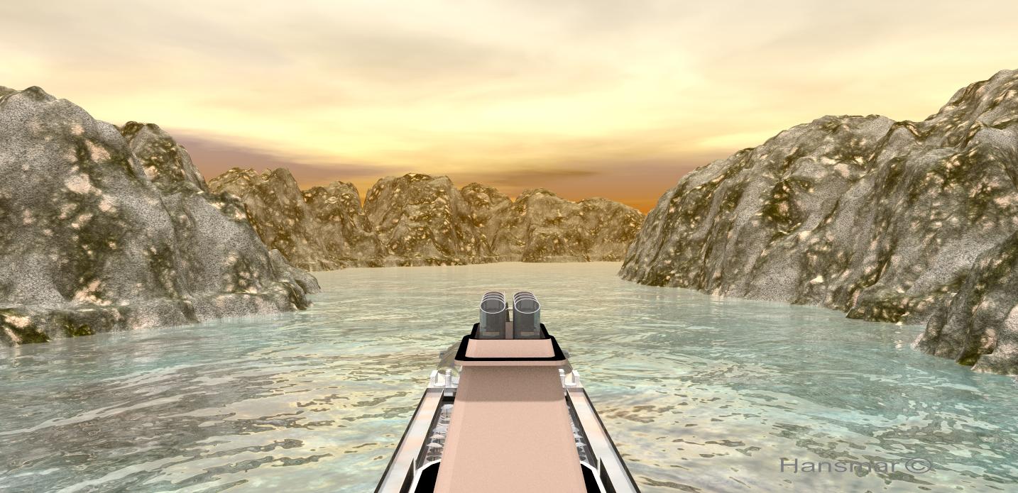I made a terrain with a height map that I took from http://terrain.party/. It is a part of a fjord in Norway. I think I might want to modify the texture. The ship is a free cruise ship from Archive3d.net. I did change the rather plastic textures a bit (some of them).