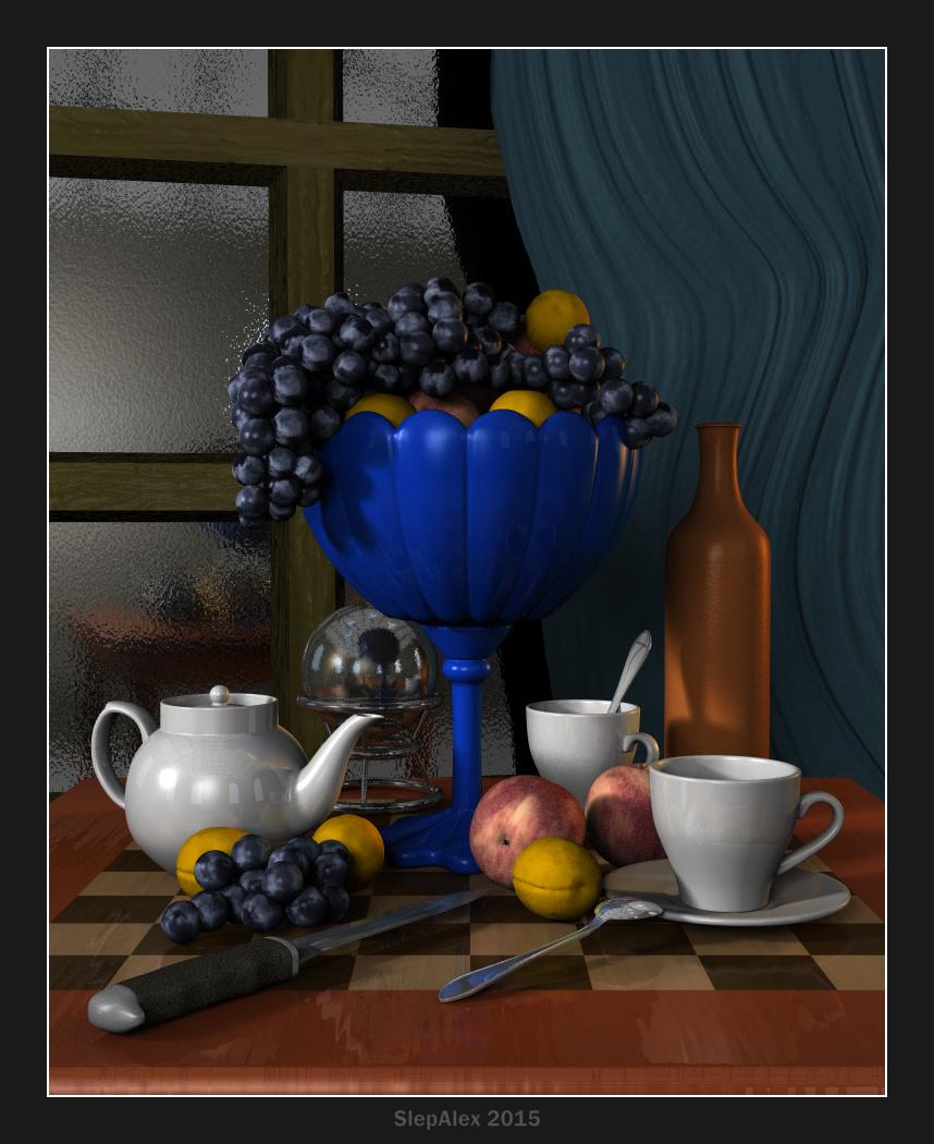 The screenshots have a view of the scene from the top and director's view. This low poly room I did in Wings specifically for reflection. It is 1,000 times "lighter" than the HDRI map. My file "weighs" only 4.64 MB. In the scene there are 4 of the light source. Two Spotlight with 100% soft shadows, one Square Dome Light (Illusion GI) and one Sphere Dome Light (imitation of the scattered light from the window). The sun is turned off. This is a classic lighting scheme for the still life. How to achieve this lighting TA and HDRI? This is no easy task!