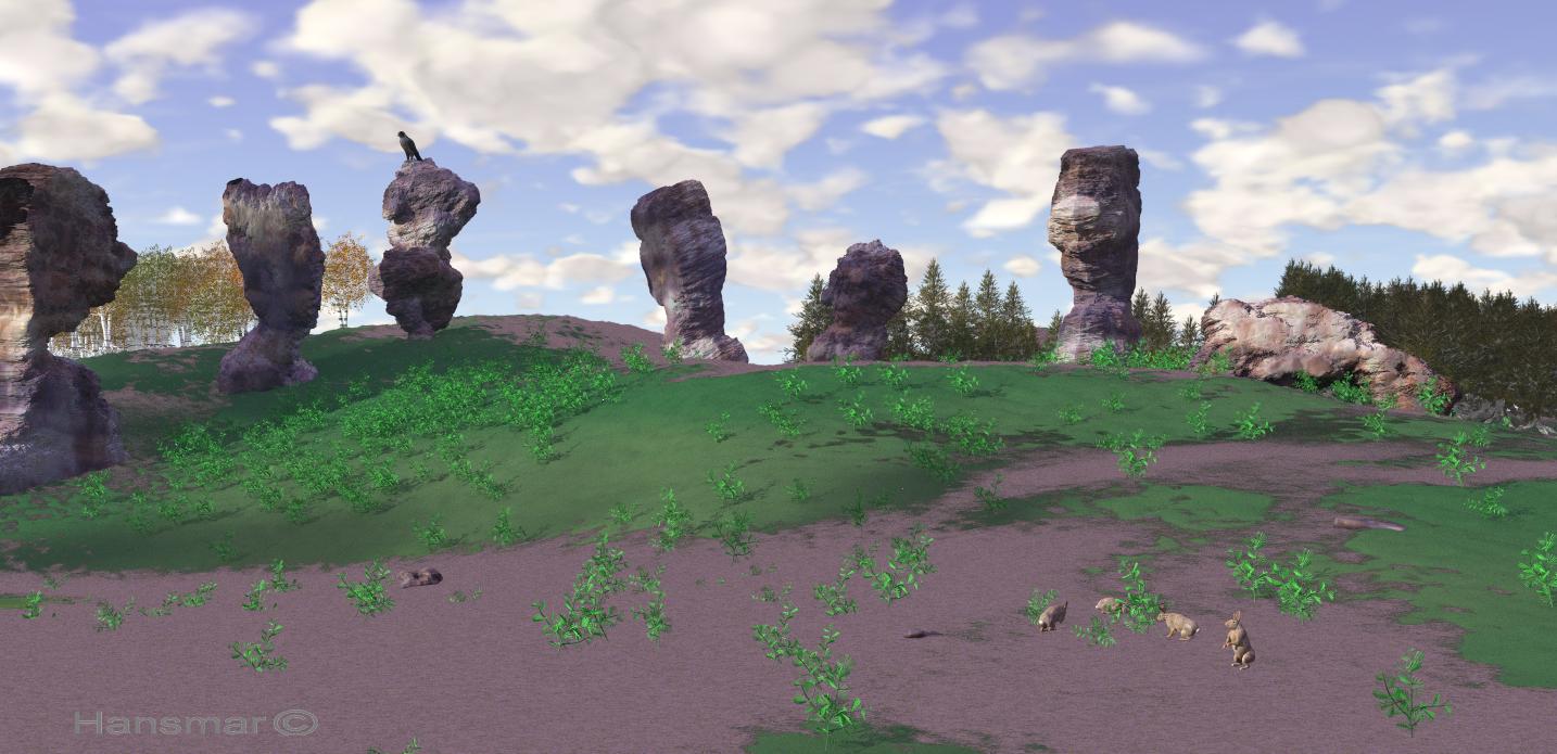 I had another go at my 'moors terrain' (with a volumetric texture on one of the two terrains). I added a lot of (special) trees and a number of smaller plants (made from premades in Plant Studio) via instancing. Rocks are from Estevez and sky is made via David's one-texture technique. The bird is from the set I mentioned several times before. The rabbits (daring animals, to be so close to this bird of prey!) are from http://www.lynescreations.com/.
