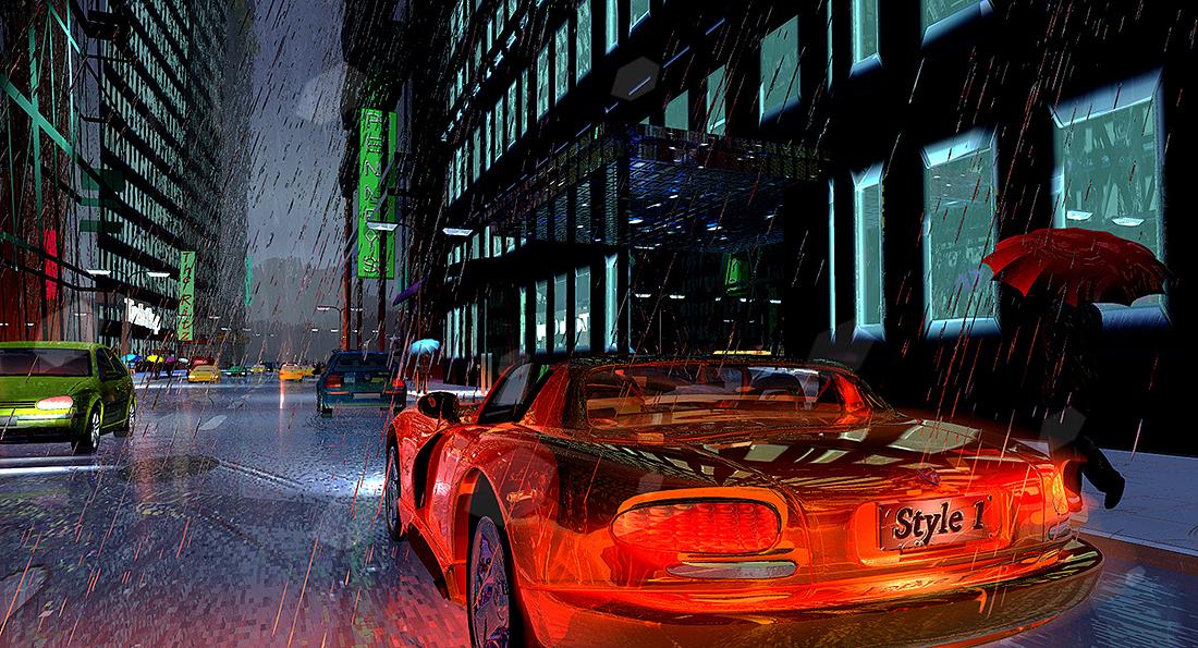Cheers, Horo, the nighttime scene demanded a lot of lights, so I suppose that's the over-saturation issue. Btw, the 'ghost-like' edge to the car (on right of image, and created by a transparent copy of the car body moved diagonally off a bit), I found, suggested movement, if not a misty feel to the wet scene, too. A good technique to bear in mind for anyone wanting to avoid those static works we sometimes create.