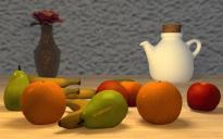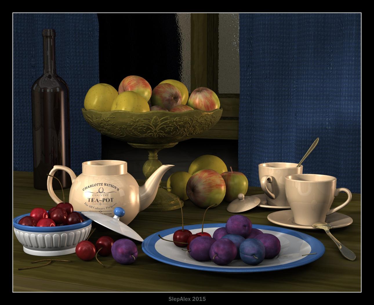 @Slepalex: Wonderful photo.... I mean, render! Fruit, ceramics, all look very realistic. And the curtain looks very good too. I love the partial transparency in the curtain, giving it a very realistic view.