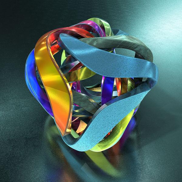 A tetra-twisted-loop cube with different funky metals applied to all eight parts. In the centre is a a radial. The main light and specular is from the IBLg_LA HDRI. Rendered premium with soft IBL shadows at quality 64 and 9 rpp.