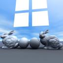 And then the two scenes. The first on the left shows a standard reflecting sphere and bunny (from the Stanford scanning respoistory - converted by Horo). Lit with HDRI made from the Bryce sky and reflecting four Bryce cubes in the sky that are lit with standard ambient. On the right, is the transparency generated reflection materials applied to sphere and bunny. Notice that this approach to reflection produces freznel effect in that grazing angles reflect more light into the camera than those perpendicular.