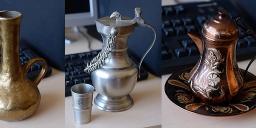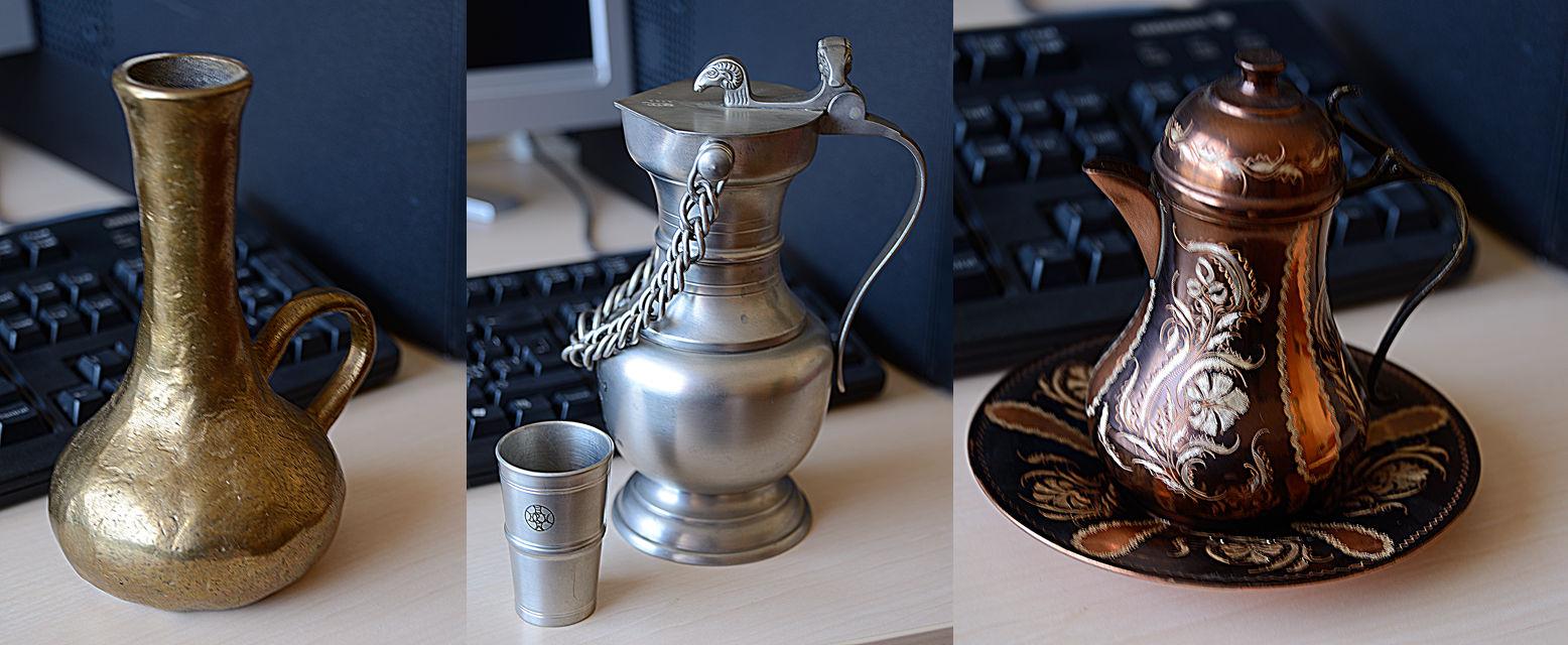 Below some metals I found in my household: brass vase, pewter jug and cup, copper and silver jar.