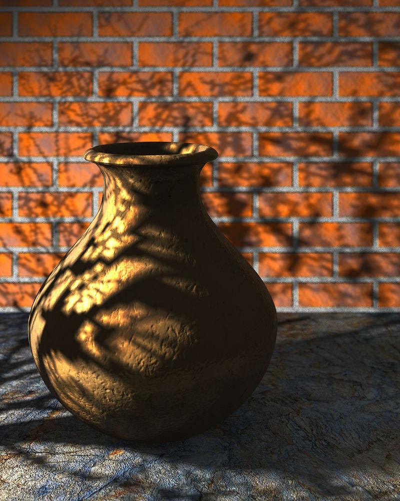 Experiment with light. The vase has a brass material, the brick wall and the floor materials I made years ago. Ambient light is from the WhiteSphere HDRI, I could have used a dome light. The main light is a spot with edge softness and a gel (or cookie, or gobo) from the library (barren winter tree).