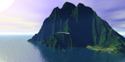 A few changes in this rendered version: The foamy waves terrain I 'overlayed' with a slightly flattened out copy with a transparent bright blue water material.
