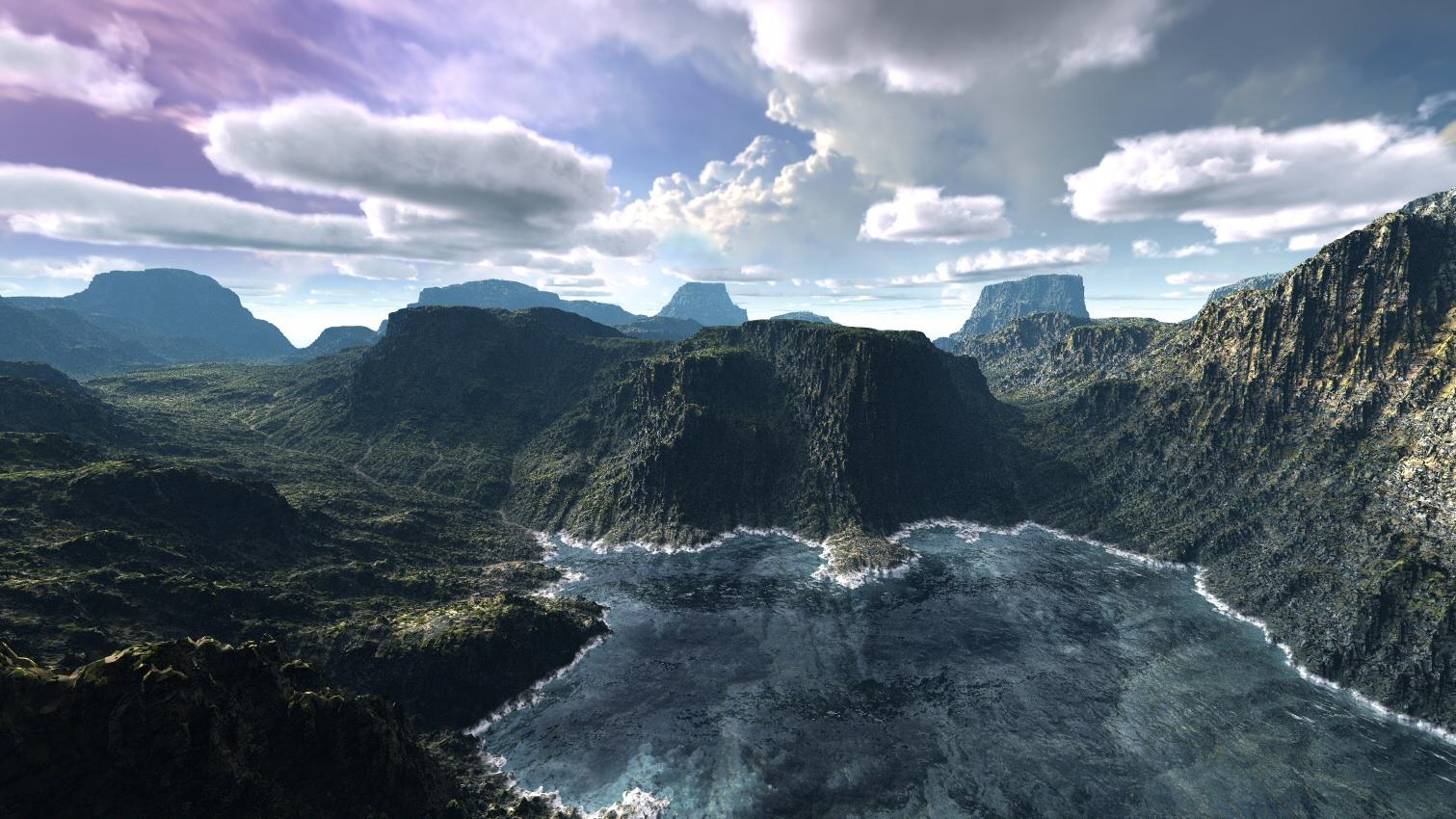 Rembrandt – the volcano render is great, the beach one awesome, I especially like the curved/arched rock. I had to look up the link on Discworld, thanks for the links, really nice render.