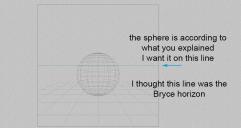 Mermaid - interesting experiment. I'm not quite sure I fully understand your question. The horizon in Bryce is at position Y=0. If you have an object that has the Size Y=50 you can put it at Position Y=25. The lower edge of the object will touch the horizon.