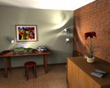 This time, the indoor came out like an indoor. I wanted to test the lamps I modeled in Bryce. The radials in the lamps have a gel I modified from the ones David gave us. First, I white balanced it, then I multiplied all pixel values by two, then copied the lower part, swapped it vertically and copied it in as upper part. Now the radial lights the inside of the lamp and also shines outward.