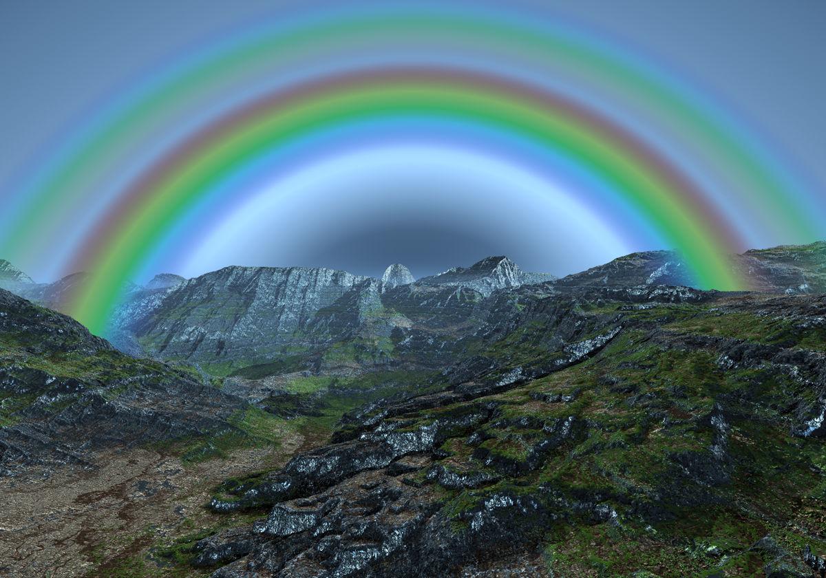 I've been experimenting with colouring backdrop and light of a white HDRI (IES photometric map converted) and I found the rainbow over the HDRI a nice addition, though highly kitschy. A cool render - the colours, I mean.