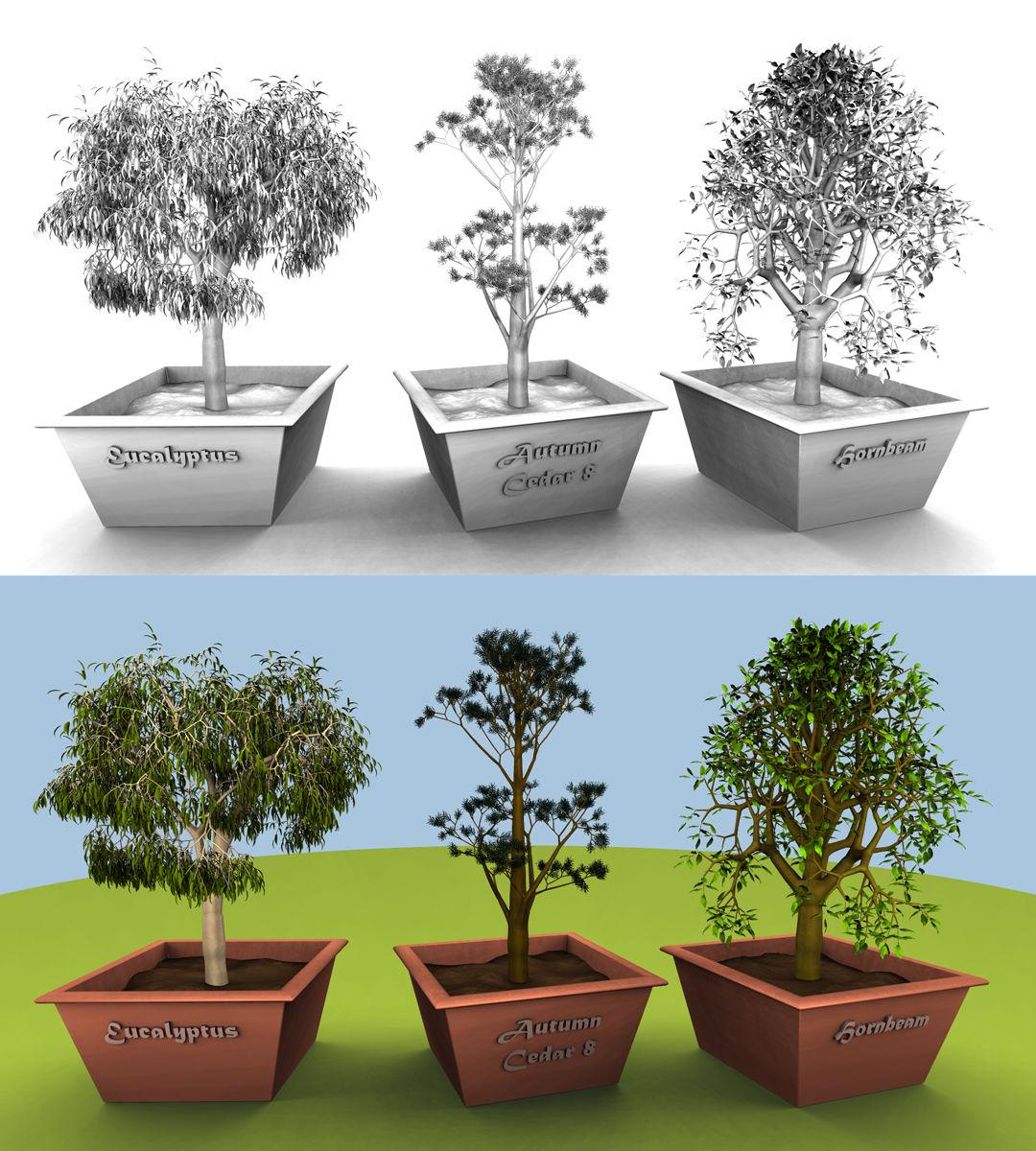 Three BryceTreeObject trees rendered as pencil sketch with the specular method. Above classic with white specular, below with coloured specular and the HDRI mixed with the sky colour, that's the only difference. The labels were made in EleFont. Specular from the WhiteSphere HDRI rendered with quality 1024.