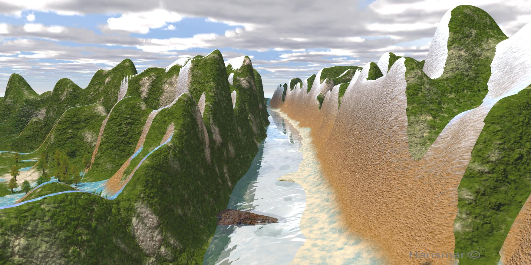 I made a landscape with a volumetric sky. The terrains (three stacked ones) are made from the close-up picture of a leaf with its veins. This provides substantial detail, because there is a lot of detail in the leave. I am nog completely happy with the textures, but wanted to show something anyway.