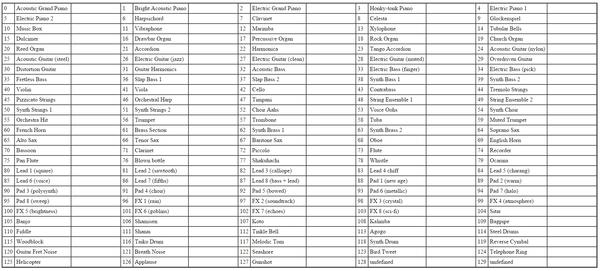 i think, each non-percussive instrument will have 1 node, and 1 property per note , only the notes used in the music piece, not the 128