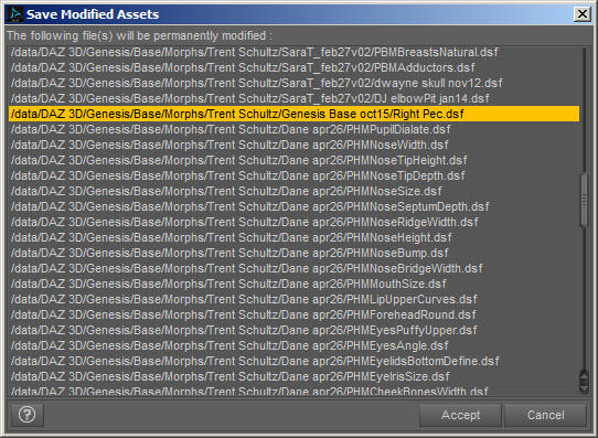 I don't follow the last part of your instructions: "mak(e) sure that your morph is the only thing checked". I don't see where I can check the things I want to change regarding Saving Modified Assets. The method I am using is going to File... Save As... Support Asset... Save Modified Assets... then the Save Modified Assets dialog comes up... with a few dozen PBMs listed etc, including the "Right Pec.dsf" I'm looking for, but there doesn't seem to be any way to select it and only it. See Attachment