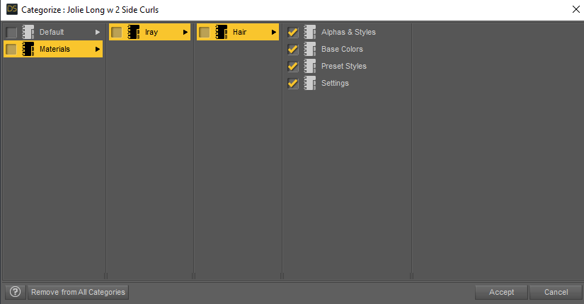As you can see I randomly picked picked an item in the smart content library - in this case Jolie hair and right clicked and chose categorize. Instead of just seeing the standard default library I also see an extra library that starts with materials. This looks like the materials structure used by OOT hair items. I seem to remember an issue I had with the OOT hair asset Mega Updo 2 where in the definition file the materials werwe set as materials\iray etc instead of default\materials\iray which created the extra folder.