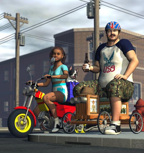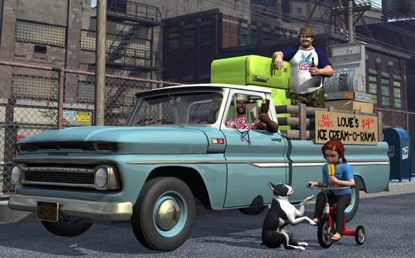 Lord Ganthor- Love it. I used to spend 5 hours every Sunday afternoon, spring through fall, in one of the family parks in the near suburbs of Detroit. At times there were as many as five different ice cream trucks competing for the business of 20 kids.... one ice cream truck jingle is bad enough on auto repeat, but when the effect is ice cream truck duelling banjos....ahhhhhh! And the trucks were as health code concious as your render. This image is amusing to me partly because it is so close to being true! Ahh, the memories. I miss Michigan...