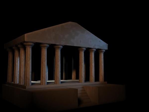 Here is a spline temple with Doric columns. I started with a 24 sided polygon on the drawing plane instead of a pure circle. I then used the pen tool to draw at the points of the polygon. I converted every third point to a curved point and moved it inside to create the grooves for the columns. The doric caps are circles with 5 sections. The middle sections were adjusted width with the symmetry extrusion preset. Curved points were used to make the doric shape.