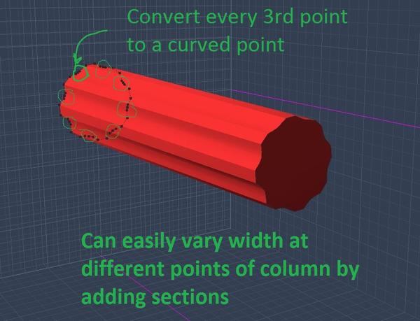 Here are some relatively complex pillars. They were built in sections in the spline modeler and grouped together in the Assembly room.