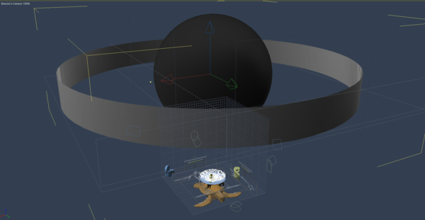 I added a sphere primitive for the sun, and textured it with the Sun shader from the default Solar System scene. Then made a vertex cylinder and scaled it to go around the sun. I created a surface replicator and set it to replicate my world turtle (I needed to reverse the normals on the cylinder to get the turtles facing the right way). Finally I made the cylinder invisible.