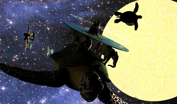For my hero turtle, I saved out the main turtle to My Objects and reloaded it. This gives me a new master that I can position and rotate with out affecting all the replicants. For lighting I positioned a bulb by each turtle. The backdrop is a Hubble telescope image off the web.