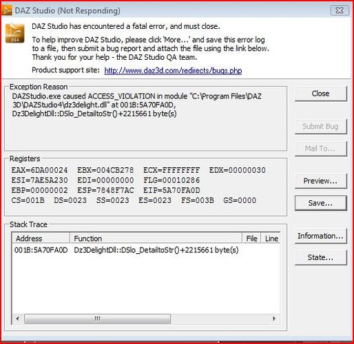 Thanks I've done that. This time it actually rendered before I got a bug report, which Daz would not allow me to save because it is no longer responding. Of course it didn't allow me to save the render and then decided it hadn't actually rendered and was showing 99% left. Daz used the entire core and memory usage topped out at 63% while rendering.