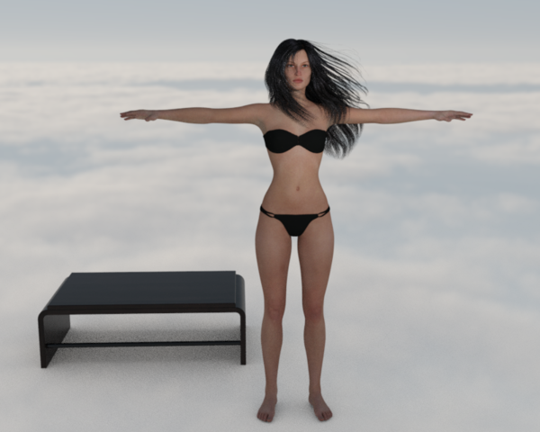First render in iRay! Bree skin on G2 female, random piece of furniture, sky clouds HDR, single spot light aimed at her face, not much spread that's why feet and hands are dark. Face looking realistic. Still not sure how to change her skin specularity. 60s render one GPU.