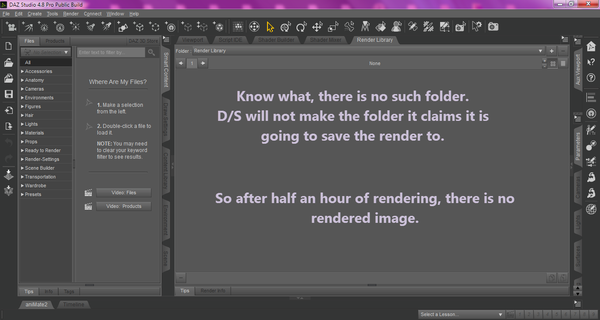 Okay ... so others don't waste their time, if the program is offering to save a render to the Render Library, a folder which may not exist if one had removed it many editions ago ... either make the folder FIRST [and hope it works], or select another place. It will NOT make the folder.