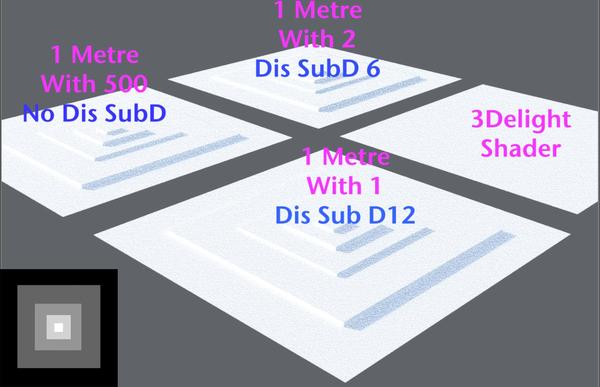 First I added a primitive plane 1 metre tile with 1 Division. I applied the Iray Uber Base and added the grey squares displacement test map I had created. When rendering there was no displacement visible, I found that Iray doesn't appear to auto divide the geometry to give enough mesh to create the displaced surface automagically. So the 1 division on a primitive plane mesh doesn't provide enough mesh to show any displacement.