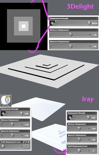 When using a base 3Delight shader displacement doesn't render in Iray at the moment.