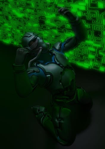 My first render just finished - have to get used to this crazy progress bar jumping around. It's grainier than I wanted. I have yet to dive into trying to get skin to look right, I ran a test that I gave up on in favor of this. Since iray seems to do well with metals and glass, i went for something I'd be less likely to try in 3delight - metal person with glass braids. I tried out using the metal flakes settings a little bit on this too.