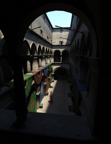 The Sponza Atrium model has oftern been used in benchmark test to see how light falls into the shadows in real time game engines. Figured I'd see how Iray handles it.