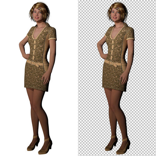 2) Side-by-side of the full-length render, with different backgrounds filling the transparent areas.