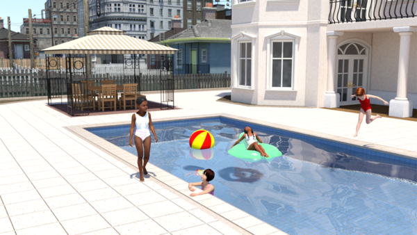 I've mostly been doing small scenes so far, but I wanted to see if Iray could handle something a bit... bigger. So here it is. I'm using the Dream House alongside the Neighbours Yard and Urban Sprawl 2 for the scenery. The figures are Mei Lin, Monique, Wachiwi using Youth morphs. The 4th is a custom figure using Belle 6's textures and Slosh's child morph (a Christmas freebie provided with the K4 UVs).