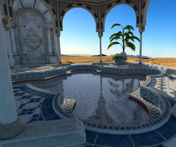 Two posts. The pool is lit by Sun-sky settings only. Only the water is done with Iray shader settings. Used a wacky wide angle setting on the render. Background is added in Photoshop.