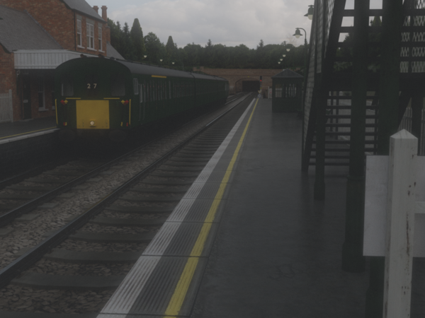 ...OK a bit more progress. Applied the wet surface settings to other parts of the scene. Also added a bump map to the platform surface, station roof and shelter roof (none available for the roof of the train itself). Also changed texture of the train to the "Heritage" map as it just looks more "proper".