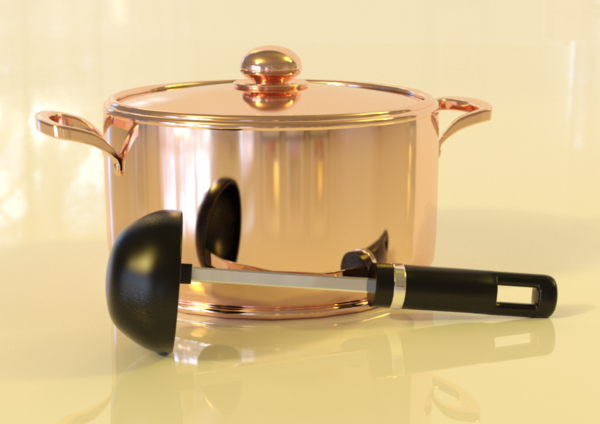 Everything shaded with the iRay shaders, including the backdrop. I turned on the top-layer on the backdrop so I could get the reflectivity I wanted on the floor. Smooth spot on the front of the ladle is due to my dof on the camera, the front pane is just passed that spot. The env map is an indoor apartment EXR. No other lights, dome only, and camera headlamp is off.