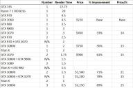 RayDAnt, one thing you might consider if you haven't already is including something like I did in a spreadsheet I made last year, where I included Price/Performance ratios to see what GPU's give you the most bang for the buck (copy attached). I basically took the newegg price at the time, then chose a base GPU to compare to (a GTX1060), and determined render time improvements in percent. Interesting though how most of the GPU's had a price/performance ratio in a narrow range of around 13-15, but when you get into multiple GPU's you're getting a lower bang for the buck (ie, higher price for a given performance improvement). Which makes sense I suppose, since two GPU's don't cut render times in half. But with single GPU's it was nice with the GTX's, because if you spend more for a better GPU you get a proportional increase in improvement and you're not getting less for more.