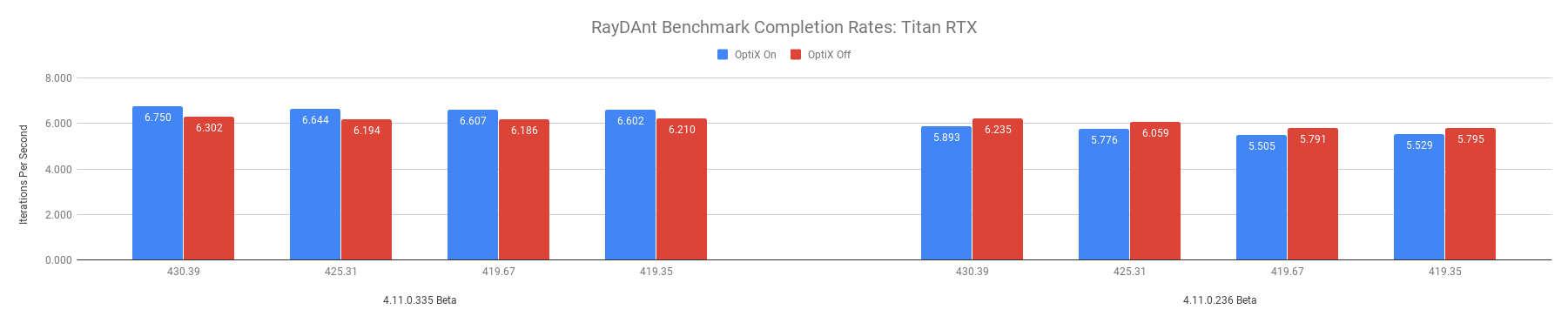 • For Turing GPU owners, not only is 4.11.0.335 measurably faster across the board than 4.11.0.236 was, it also restores OptiX Prime acceleration's status as a rendering accelerator for all scenes tested (somewhat surprisingly, since 4.11.0.335 includes the exact same OptiX Prime binary file as previous.) So if you have Turing, you should start turning OptiX Prime back on.