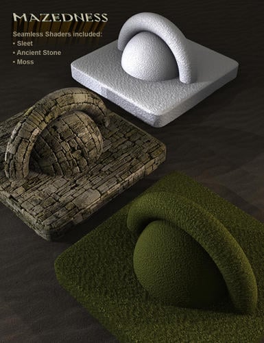 This set also Includes seamless tiled shaders for ancient stone, thick moss, and icy sleet. With the included sleet shader you can turn all of the moss into frozen snow and the water into a sheet of ice, don’t slip!