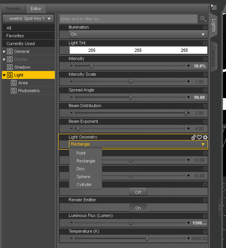 I think the 'Light Geomitry' and the "Hight (Diameter)" and "Width" is supposed to control that. I've managed to just enough renders at this point to be sure that faking a sun with anything other then a "Point" geometry doesn't work. As for making larger soft boxes with them, I don't know yet. It's size of the light surface, vs it's distance. And I think the geometry setting is only for Iray? And distance plays havoc on light levels as well, lol.