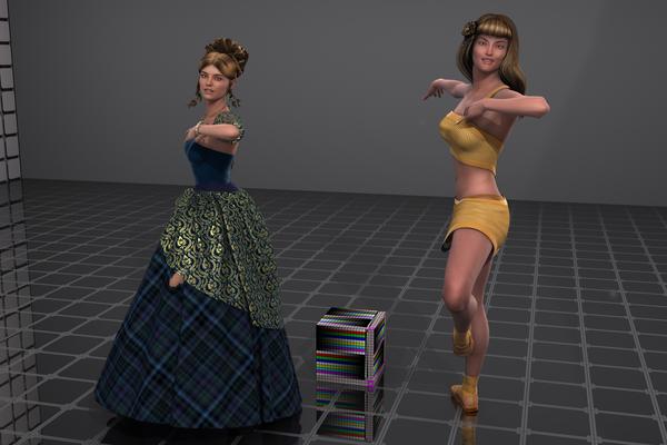 “O” I broke another dress, lol. The one on the left dose not appear to have bones that function, and the two figures are in the same exact pose (CB_Stage 04b). And the facial expressions, well, I was able to do spot renders with FWSA Riva to get it close. As for Face-plant-goddess, I clicked a preset and prayed it would simply be close enough, lol.