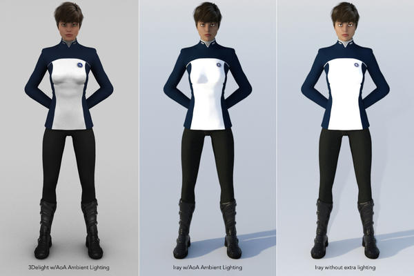 So, as I test, I did a quick scene with a model I've used in the past. I did a test with 3Delight with AoA's Ambient Light, a test with Iray with AoA's Ambient Light and then a test with Iray with no extra lighting at all.