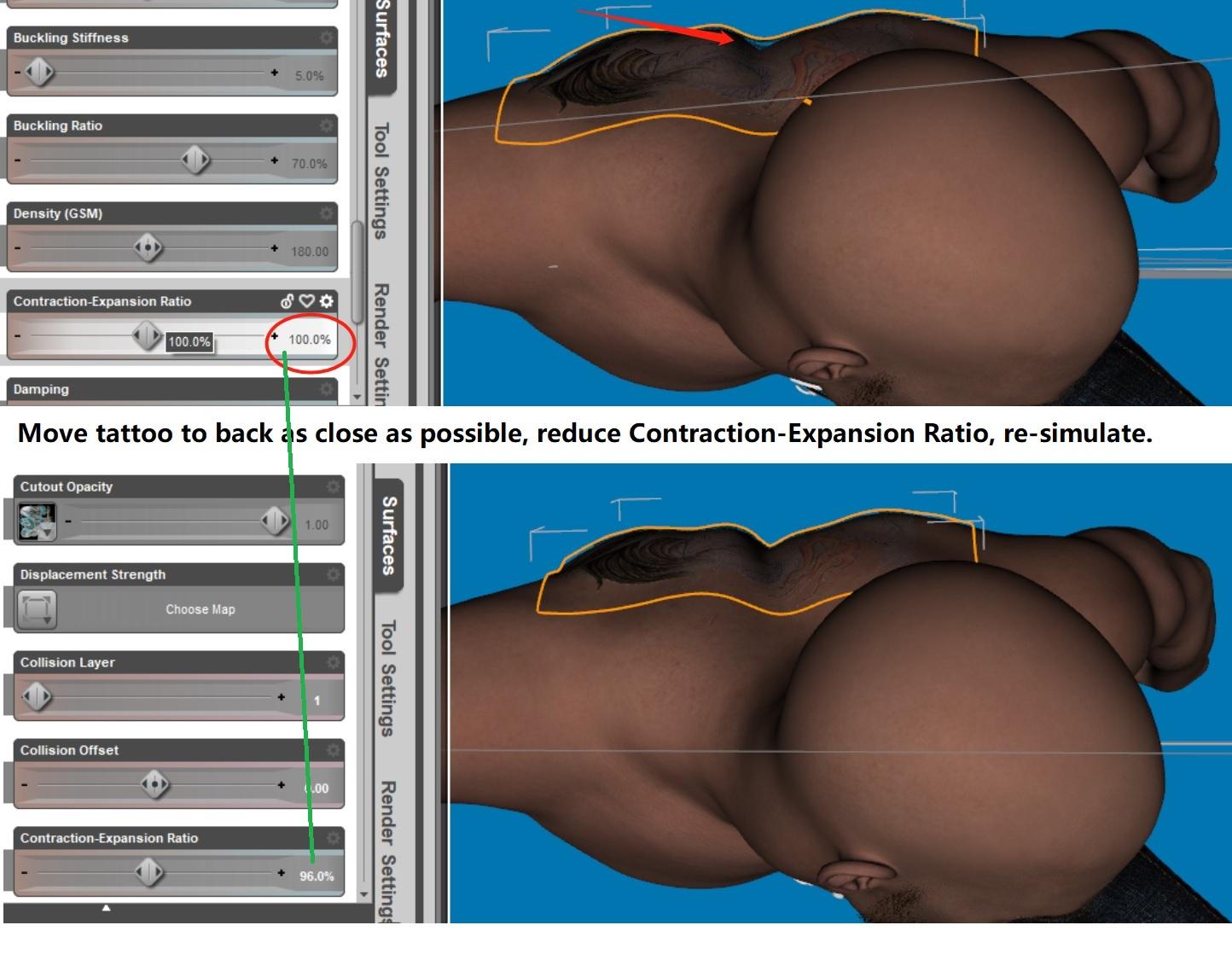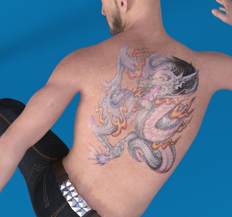 For long time, to put tattoo at back is difficult for DAZ users because the skin map connection seam, normal ways are using ZBrush or Iray Decal node or L.I.E. Now here is an idea to do it in DAZ only, use dForce primitive plane, the result is better than decal, and easier than LIE. However, this idea's problem is, every new pose may needs to be re-simulated.