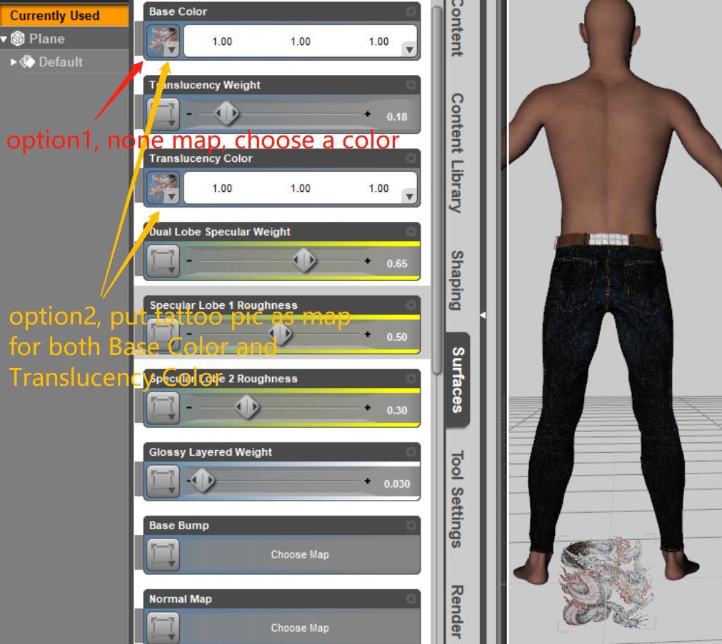 2. in surface tab, copy figure torso surface and paste to the plane, then in the plane's surface set every map drawings such like Translucency Color, Dual Lobe.., Base Bump, Normal Map, etc., to None.