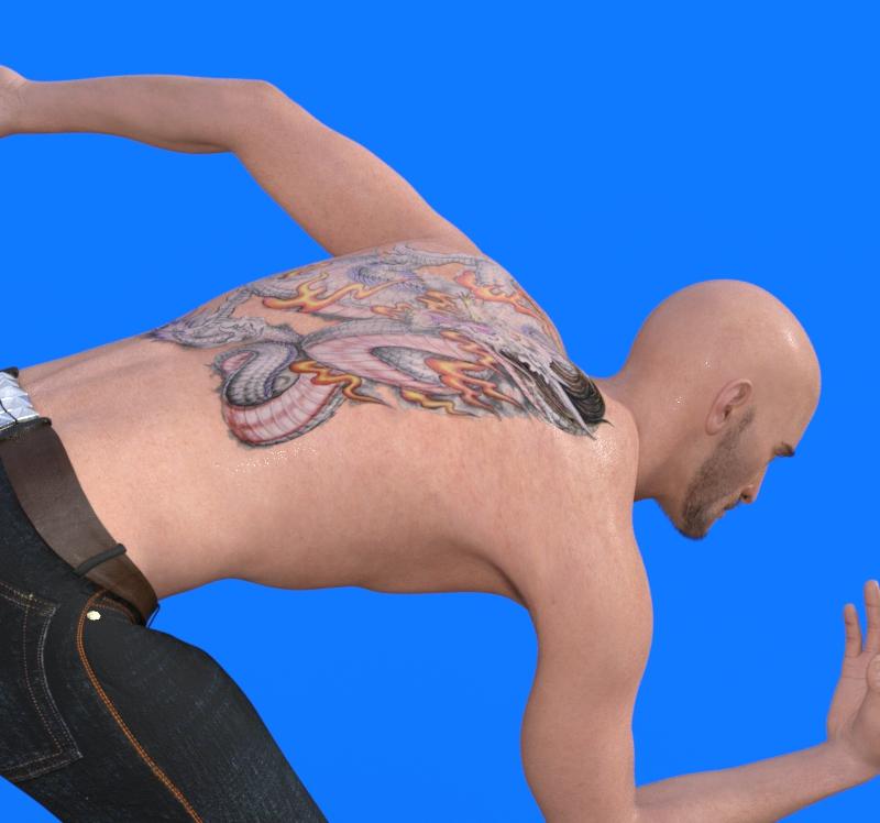 9. in simulation settings, turn off the Start Bones From Memorized Pose, choose Current Frame. Now click Simulation, the tattoo will fall down to the back, tattoo is done, rotate the figure back to his pose position, cast photos as you wish. If still feel the tattoo is not tightly pasted enough, try adjust the tattoo plane's Z position a little bit (about 0.1), wait few seconds to see the result.