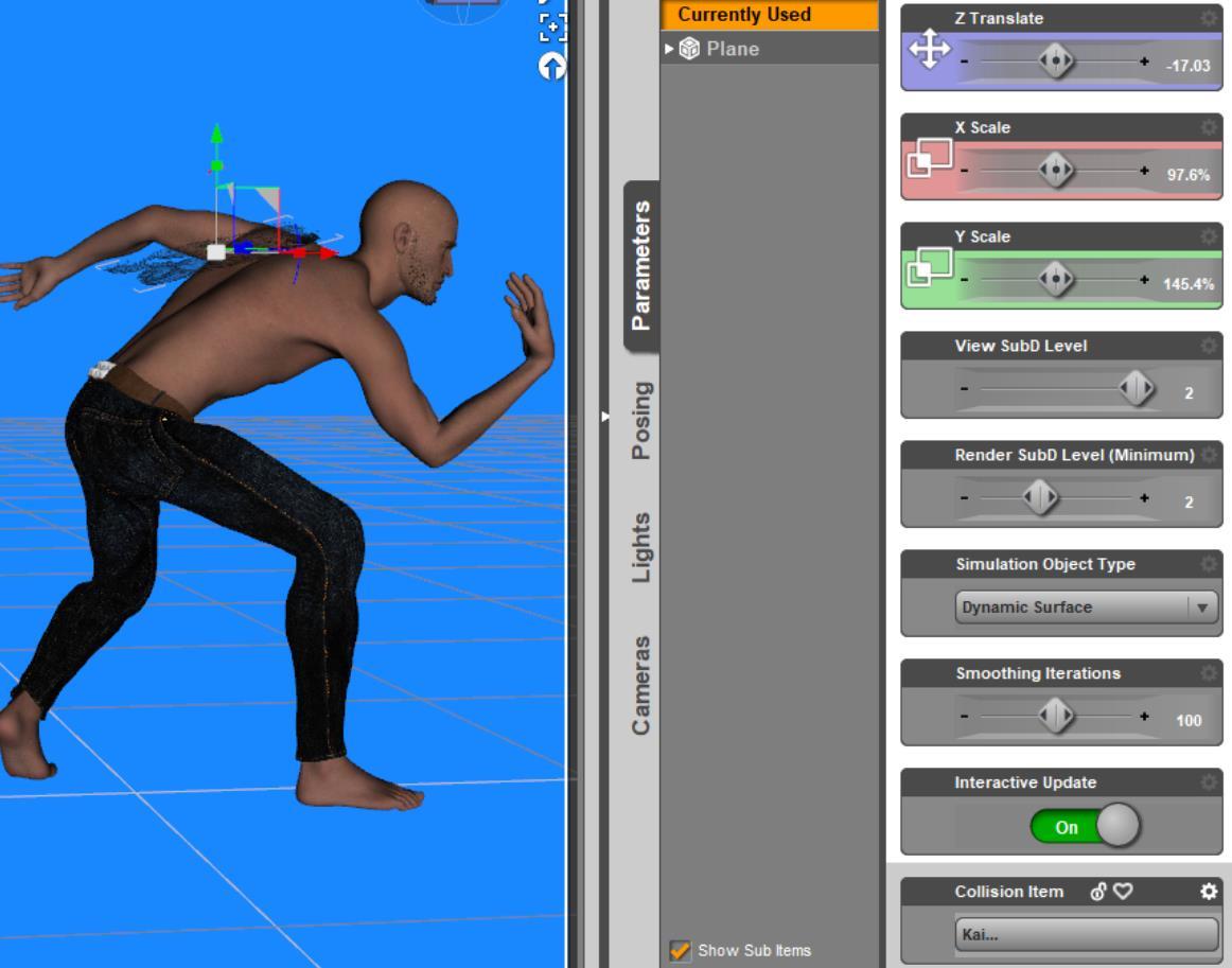 5. recommend to add Edit-Object-Geometry-Convert to SubD to the plane, then change Parameters-Resolution Level to High, and View SubD Level to 2. Add Edit-Object-Geometry-Add Smoothing Modifier, change Smoothing Type to Generic, Smoothing Iterations to 50 till 100 (try any to see the result, but this number will extend the simulation time), Collision Item point to the Figure. The purpose for these is to avoid the tattoo not tightly pasted on the skin.